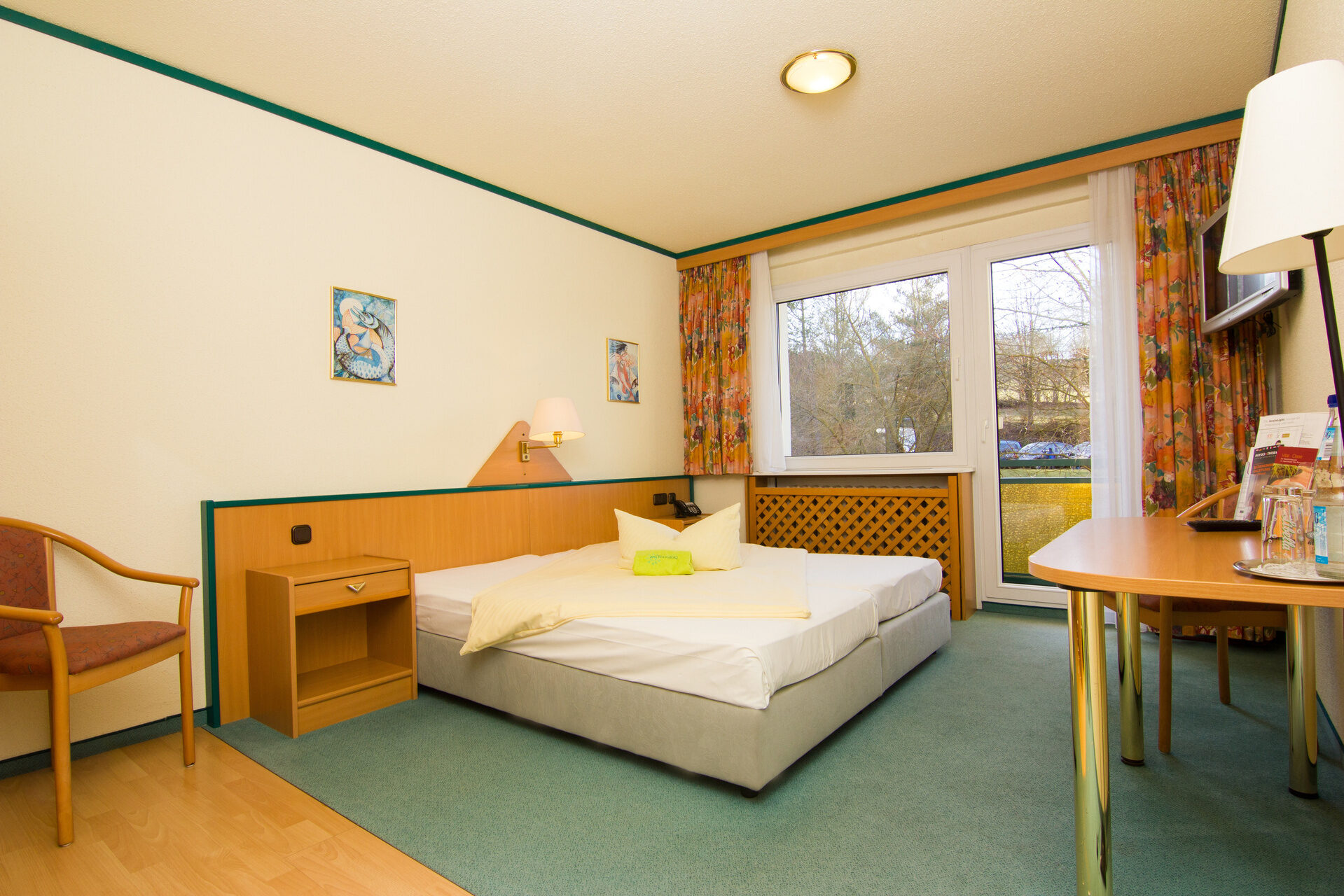 Doppelzimmer Superior: Höchster Komfort für Ihren Urlaub in Thüringen – getrenntes Bad/WC und Balkonblick.